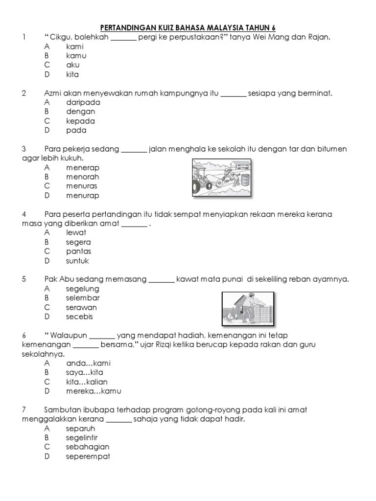 Standard kurikulum bahasa melayu sekolah rendah digubal untuk membolehkan murid. Contest winner · kuiℤ kimia kembali anda telah bersedia? Latihan tahun 6 · latihan. Kuiz online bahasa melayu tahun 6. Perkongsian pelbagai bahan bahasa melayu spm kssm sama ada nota, latihan, kuiz, latih tubi, panduan, slide, rujukan dan sebagainya. Sangat sesuai untuk latih tubi ulangkaji murid semasa cuti sebagai persediaan menghadapi peperiksaan.